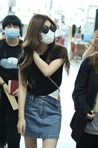 一个大约20出头的女生带着墨镜,穿着黑色短衫和牛仔裙,衬托出她很白