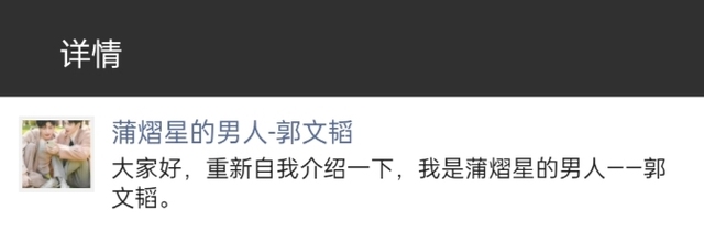 蒲熠星的男人-郭文韬微信朋友圈:大家好,重新自我介绍一下,我是蒲熠星的男人-郭文韬