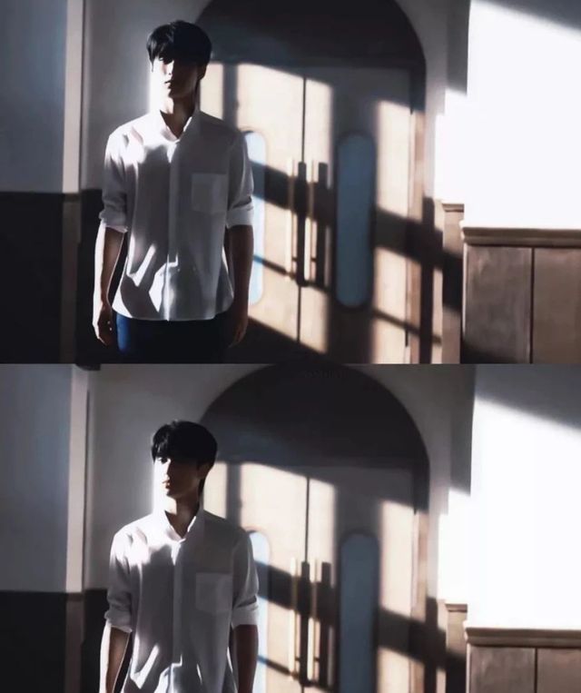 抬起头便看见蝴辣飞去的尽头, 阳光斜照间站着个身姿挺拔如苍松的少年。他藏着帽,帽下黑纱过肩,身着银灰色的前袖圆领袍,袖口与正心皆绣有墨色的日月星云,头发以银质发冠束得整齐,唯帽外垂下两道泼白色发带。蝴蝶自少年的头侧翩翩飞走,他微微侧身躲道,将阳光撒进发带划出一道潇酒的引度。
