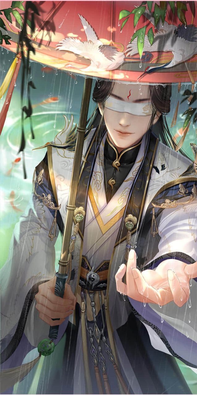 身随念转,你侧身一望,隔着雨帘,望见了撑着丹红游鹤伞、风姿俊逸立于树下的弦尘,满潭的红鲤都成了陪衬。