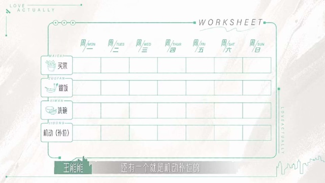 王能能买菜,做饭,洗碗,还有一个就是机动补位的。就是说有一些人如果他真的是今天不能来,或有事情耽误了,这个机动补位就上去填他的坑