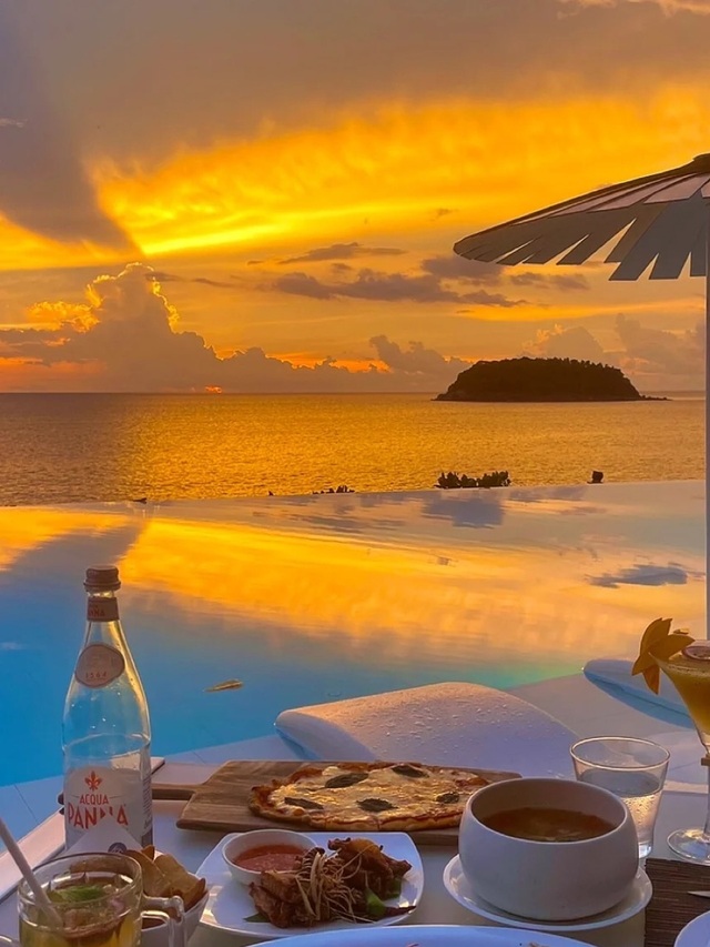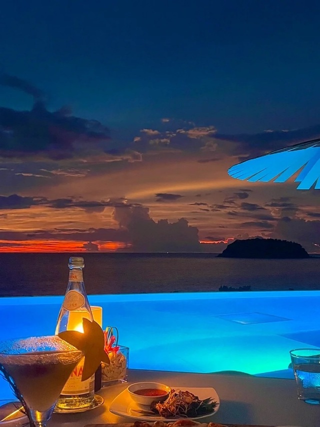 两人在海边餐厅吃饭刚好看见日落
