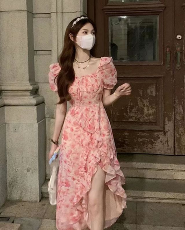 一个女孩穿着粉色连衣裙站在Y市大学门口打着电话.