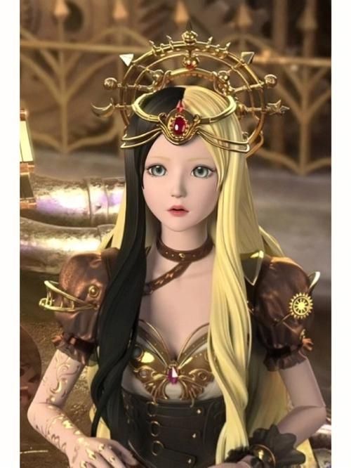 她身穿夹杂机械朋克风的裙摆上有繁复的装饰,头戴太阳神发箍,腰间束着皮带,脚穿金色红宝石高跟鞋。