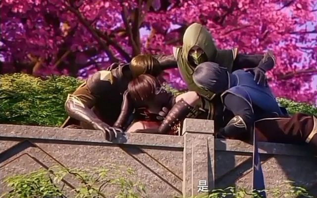 绿刺客摁住两名刺客,而橙刺客躺在他们下面听着