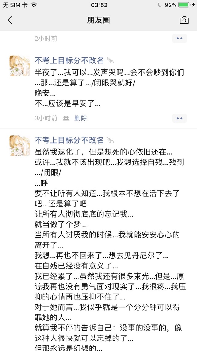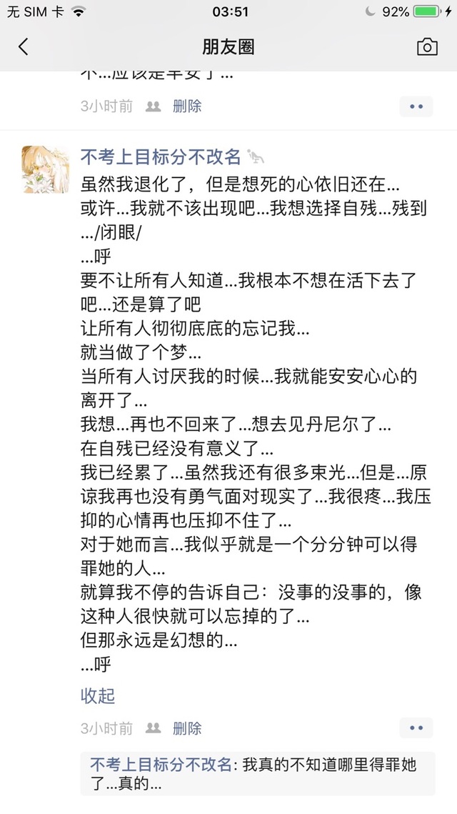 洛柠·音桐虽然我退化了,但是想si的心依旧还在… 或许…我就不该出现吧…我想选择zican…can到…/闭眼/ …呼 要不让所有人知道…我根本不想在活下去了吧…还是算了吧 让所有人彻彻底底的忘记我… 就当做了个梦… 当所有人讨厌我的时候…我就能安安心心的离开了… 我想…再也不回来了…想去见丹尼尔了… 在zican已经没有意义了… 我已经累了…虽然我还有很多束光…但是…原谅我再也没有勇气面对现实了…我很疼…我压抑的心情再也压抑不住了… 对于她而言…我似乎就是一个分分钟可以得罪她的人… 就算我不停的告诉自己:没事的没事的,像这种人很快就可以忘掉的了… 但那永远是幻想的… …呼
