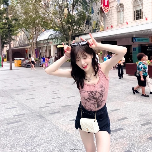 照片里的女孩身着粉色吊带,衬得肌肤愈发白皙剔透。一条墨蓝色牛仔短裤勾勒出青春活力,她吐着舌头,露出一抹俏皮可爱的神态 而那栗棕偏黑的发丝,自然地卷成柔和的波浪,为这份灵动增添了几分柔美