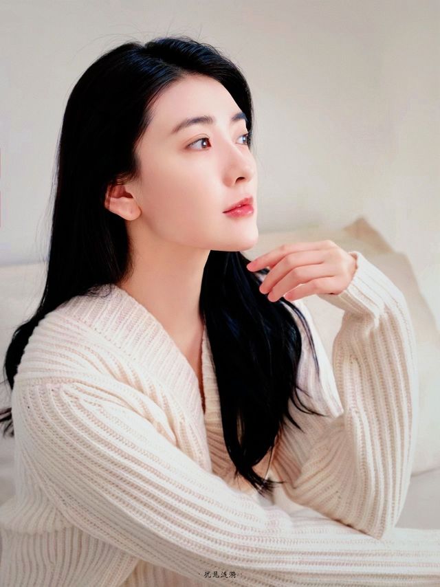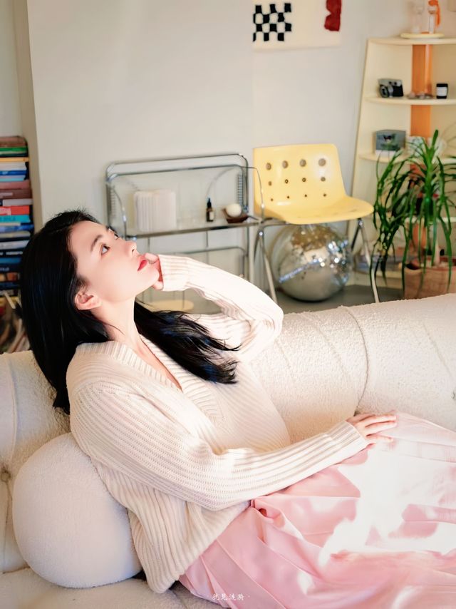 梁洁今天一身白色毛衣,过肩披发,粉色半身褶裙。在活动方要求的布景里拍摄着产品代言。