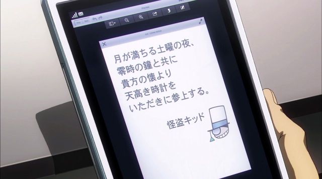 满月的星期六之夜,在下将伴随着零时钟声,前来拜领阁下怀中高耸之神。——怪盗基德