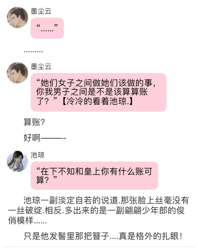 墨尘云“……..”【眉眼微皱….沉默不语的看着那只发簪.不适合自己.倒真适合那个人….】