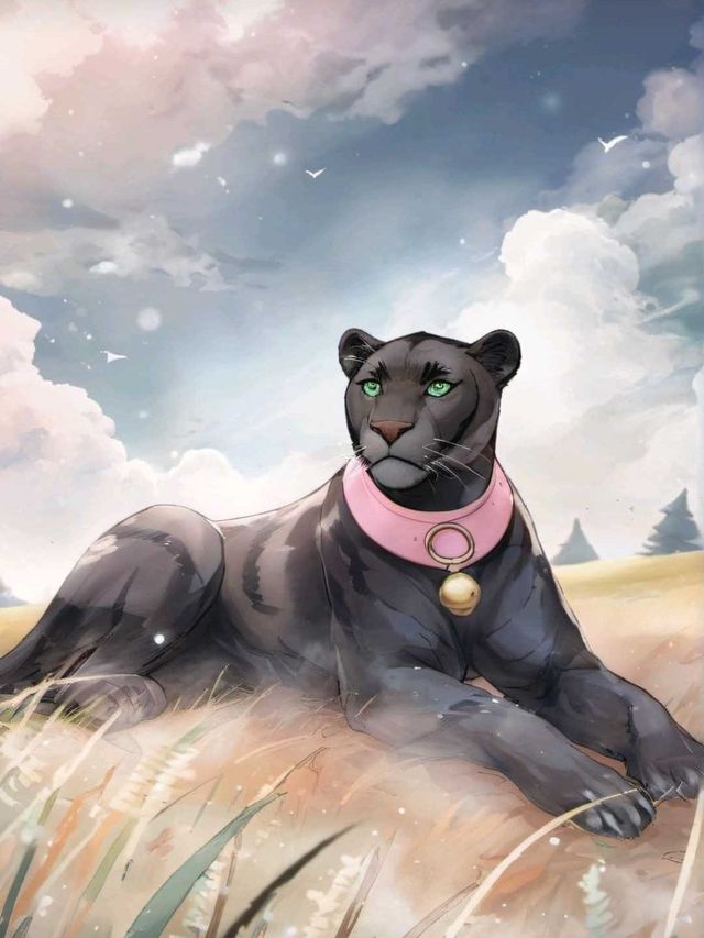 对面叼着小宝宝的黑豹无奈的放下孩子趴卧下来,奇怪的是,脖子上还有一个玫粉色项圈