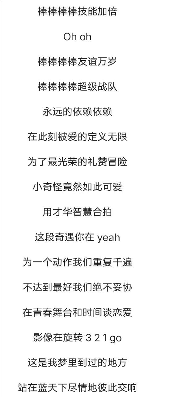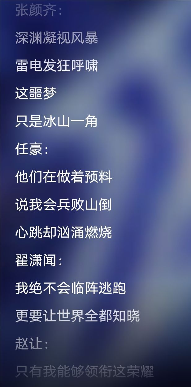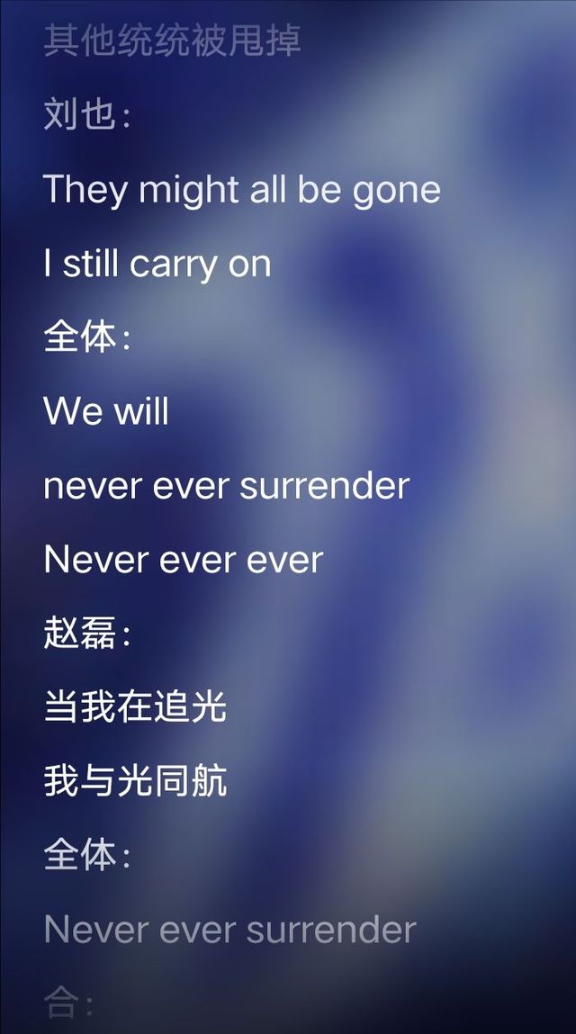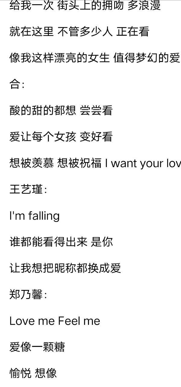 火箭少女101Sunnee/李紫婷/傅菁/徐梦洁:等它吹灭了我的年少 突然就成熟了 紫宁:被风吹散过能抱更紧了 孟美岐/吴宣仪:雪也落下过 hoo 雨也落下了 Sunnee:而我也不再是那个我 大合唱:落叶掉落过 hoo 湖水融化了 曾经飞翔过 就不想再坠落 一起迎着风 一起飞行 好吗