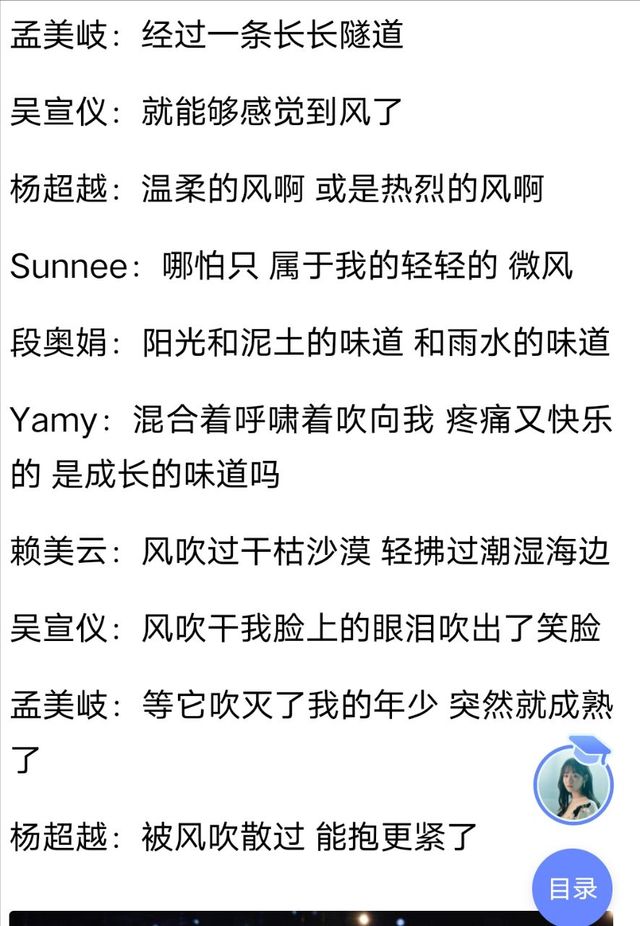 火箭少女101段奥娟:经过一条长长隧道 陈意涵:就能够感觉到风了 紫宁:温柔的风啊 或是热烈的风啊 李紫婷:哪怕只 属于我的轻轻的微风 傅菁:阳光和泥土的味道 和雨水的味道 李紫婷:混合着呼啸着吹向我 徐梦洁:疼痛又快乐的 傅菁:是成长的味道吗 杨超越/段奥娟/Yamy/赖美云/紫宁:风吹过干枯沙漠 轻拂过潮湿海边 陈意涵:风吹干我脸上的眼泪吹出了笑脸