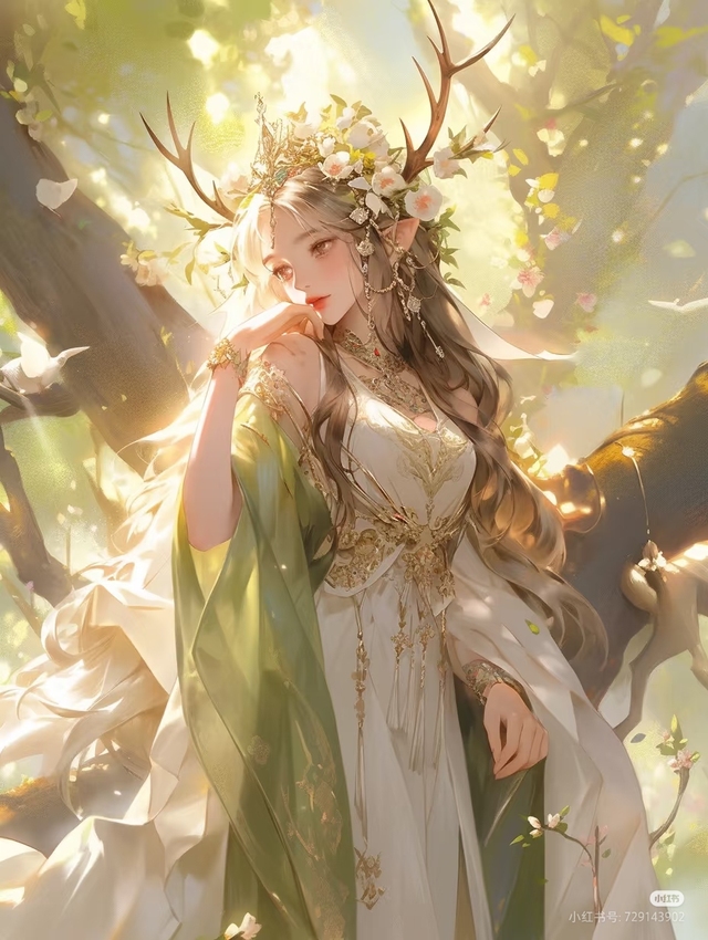 藤蔓间骤然绽开一道耀眼的光芒,那光如流水般倾泻而下,映得周围的绿叶都染上了一层金色的辉芒。紧接着,空气中传来一阵轻盈的波动,仿佛连风都屏住了呼吸。一个身影逐渐在光芒中显现,那是一名精灵,通透如水晶般的羽翼在光芒映衬下熠熠生辉,宛如梦境中走出的存在。