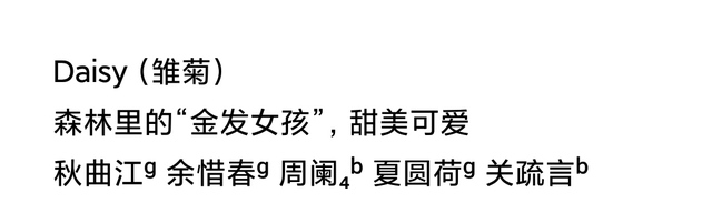 第一行是队名 第二行是队名的意思 第三行是成员 角标是性别啦