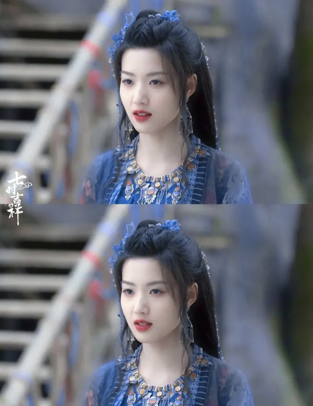 发髻高挽,松松束着,一朵紫色绒花斜簪其间,柔软细腻的花瓣微微颤动,为她的娇柔增添了几分灵动,发后垂落的紫色流苏随动作轻轻摆荡,如同夜风中摇曳的紫藤,慵懒而不羁,耳畔银饰与衣上的珠玉相互碰撞,泠泠作响,宛如山间清泉叮咚。