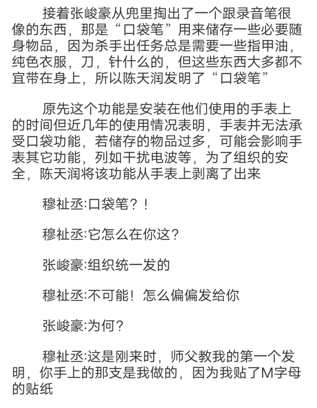 穆祉丞接过笔后发现那笔就是穆祉丞做的那支口袋笔,上面那个M的贴纸被张峻豪贴了个防水贴上去,然后旁边还刻着“穆祉丞”以及穆祉丞的电话号码