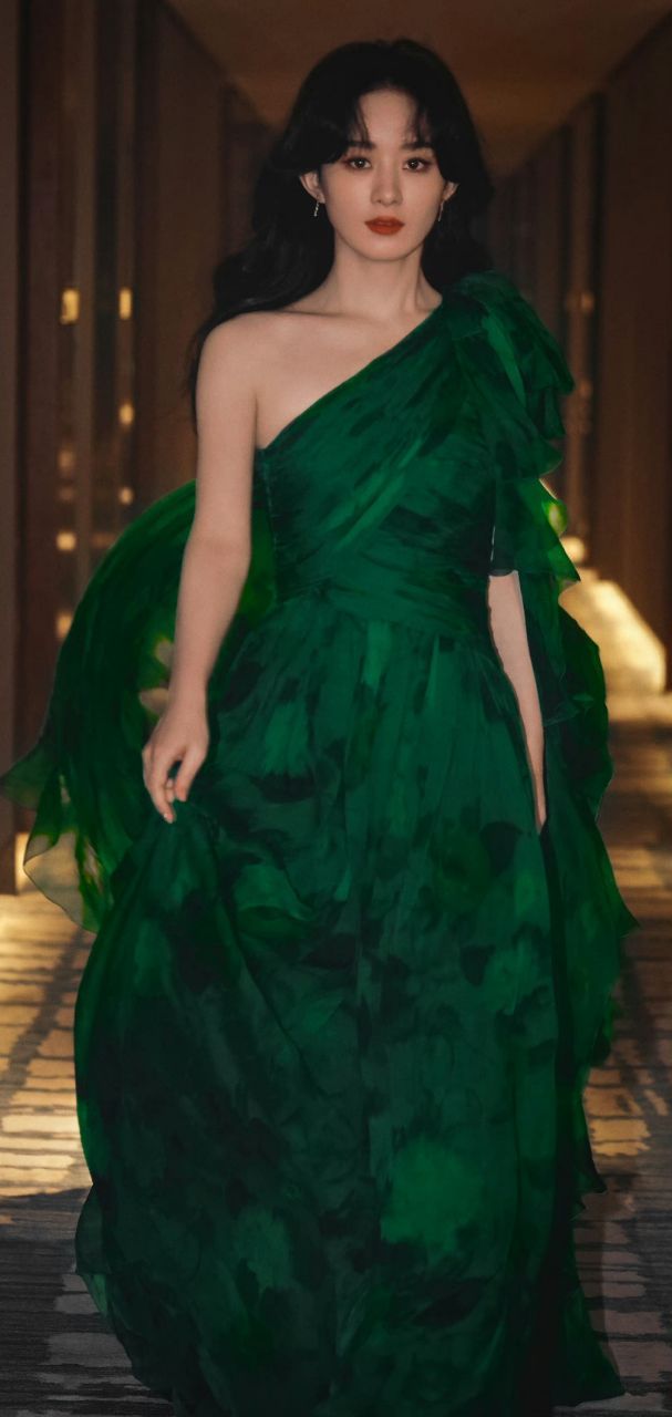终于,大门再次打开,江纾身穿墨绿斜肩水墨纱礼裙,微卷的头发卷成港风波浪卷散在肩上,露肩设计,更是展示了江纾修长的锁骨和迷人的肩线,整个人显得优雅华贵,气质非凡。