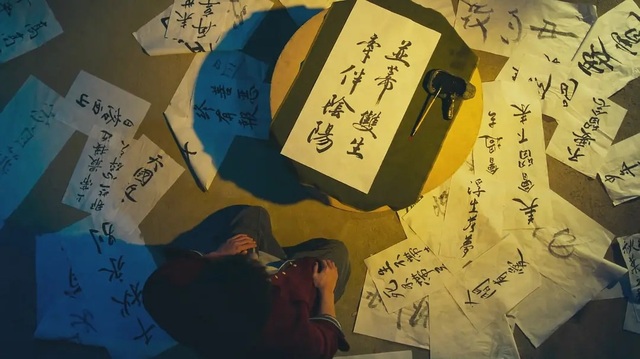 拿来爷爷书法教室的抽字箱。一阵风起,木箱内的纸纷纷飘出,一永心情镇定,将飘下来的文字,磨墨提笔写下,充满力量的文字包裹着它