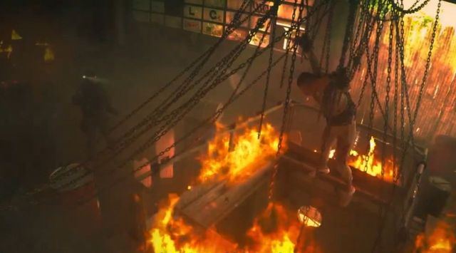 货仓着火了,里面的电线被燃烧,带起了零星火花。