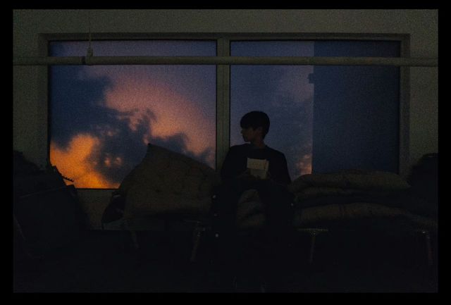 夜晚的月光照在窗户上,室内昏暗的灯光阻隔了它的进入,像一道分界线,割开了两个世界。