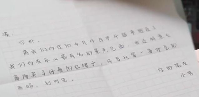离我们约定的4月13日中午越来越近了,我们约在乐山最有名的景点见面,我还特意去商场买了好看的红裙子,你可以穿一身帅气的西服,到时候见。