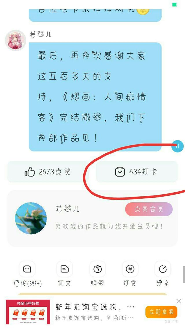 若兔儿加更制度与之前差不多,不过有所改变:会员加更三章,因为要和会员保持差不多的平衡,打赏改成满19金币加更一章,个人打卡满6天加更一章。
