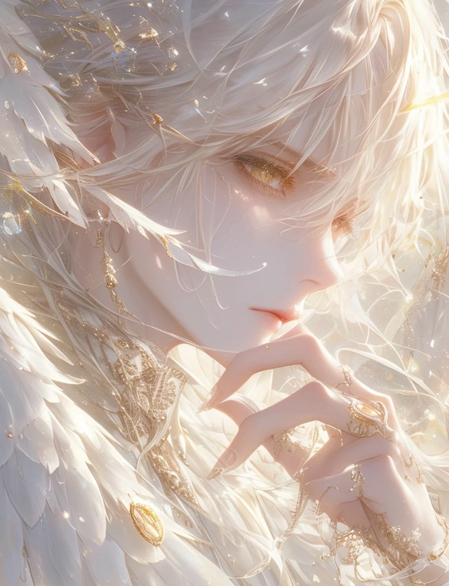 时间在悄然流逝中,金色雕塑的外壳逐渐融化,光芒渐渐收敛.从那逐渐消散的光球中,一位身姿挺拔、气质非凡的男子缓缓浮现.他的身形修长而优雅,宛如一件精心雕琢的艺术杰作.紧致有力的腰身下,腹肌的线条隐隐可见,更添几分阳刚之美.他的头发好似镀了金,透着隐隐光泽.最引人注目的,是他背后那对羽翼,每一次轻轻扇动,都散发着浓郁的神圣光辉,令人不由自主地心生敬畏.