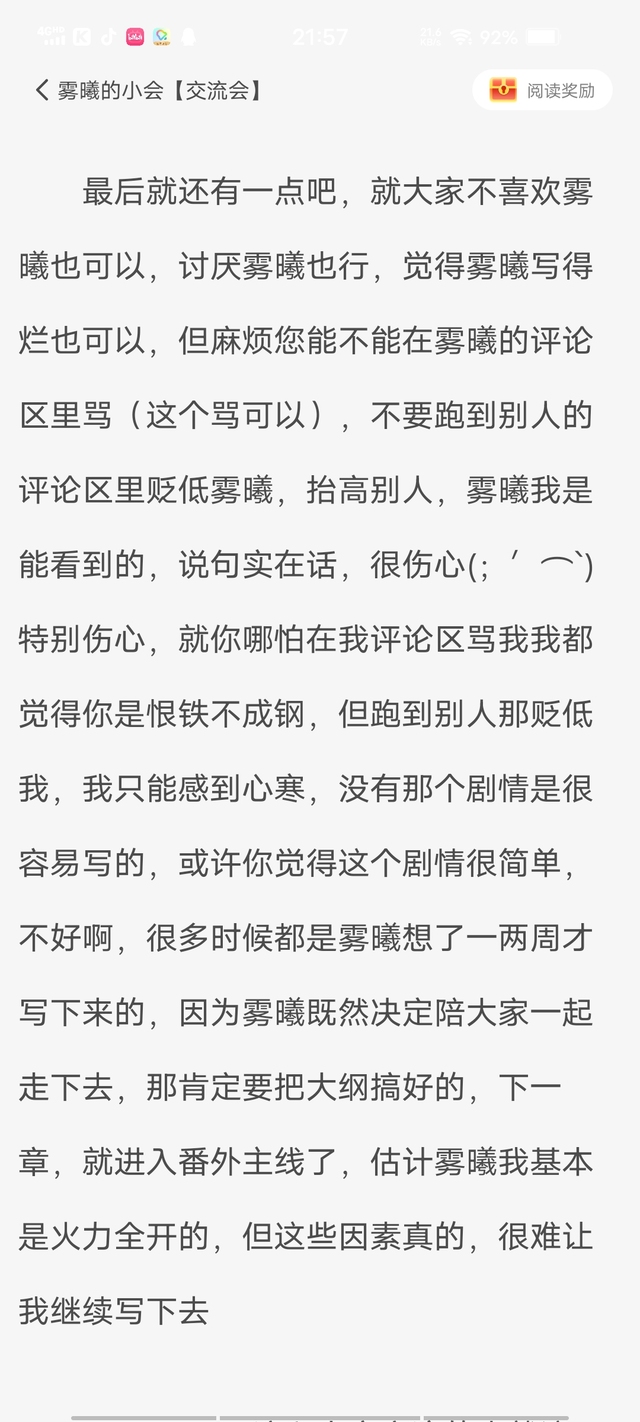 作者怎么回事?他这是怎么了?在此本作者不得不声明一下,在我还没开始用写小说时我最欣赏的就是这位叫雾曦的作者的文,我在上周看他的文时还有,他为什么一下子显得这么低沉?