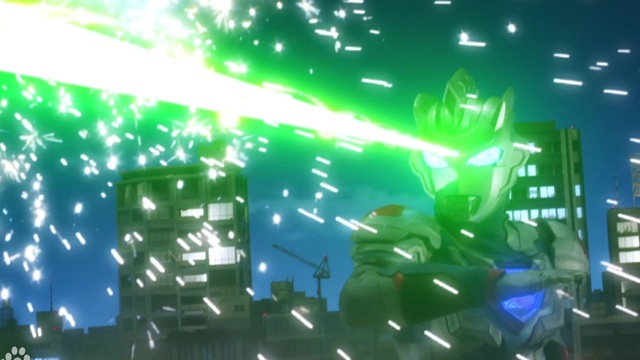 小女孩捂住了眼睛,似乎已经意识到了自己的结局,但过了几秒,楼仍然没有砸下来,她抬头望去,只见一位高大的银蓝色巨人用双手抱住高楼,扔了出去。