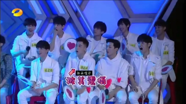 接下来是一男一女共4组分别表演才艺,由X玖少年团投选,喜欢哪组表演就举牌子选哪组。