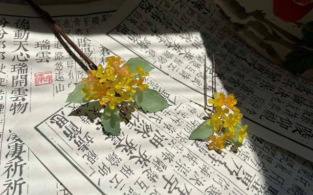 陵容将盒子摆放在自己面前,满含期待的翻开盖子,看到了放在其中的发簪,是一只桂花发簪和一对发钗,上面的桂花栩栩如生,就如在亭子外边的桂花树上的花蕊在那上面绽放