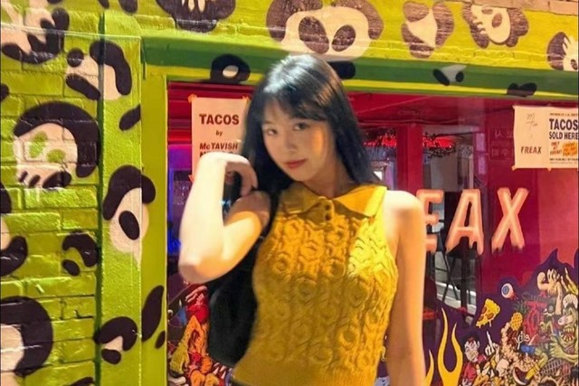 女孩穿着亮黄色的吊带从门缝探出头来