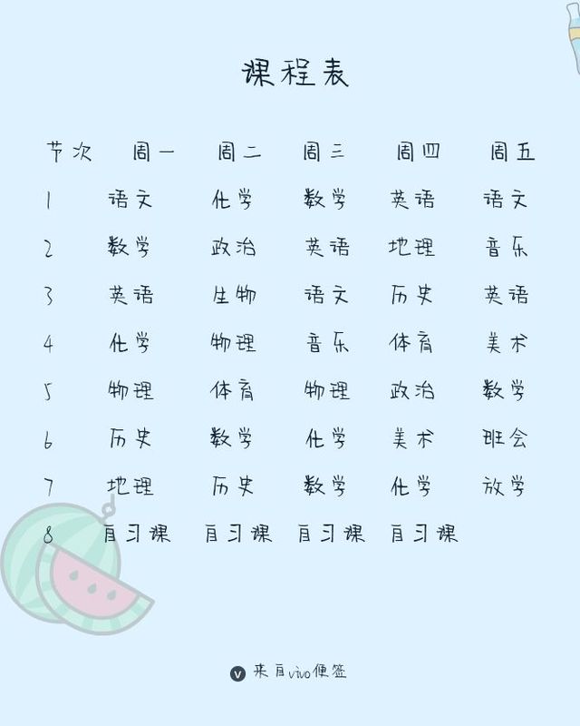 女主去看的时候,拿了一个便利贴,看了一下课程表和作息时间,并且记录下来课程表的内容