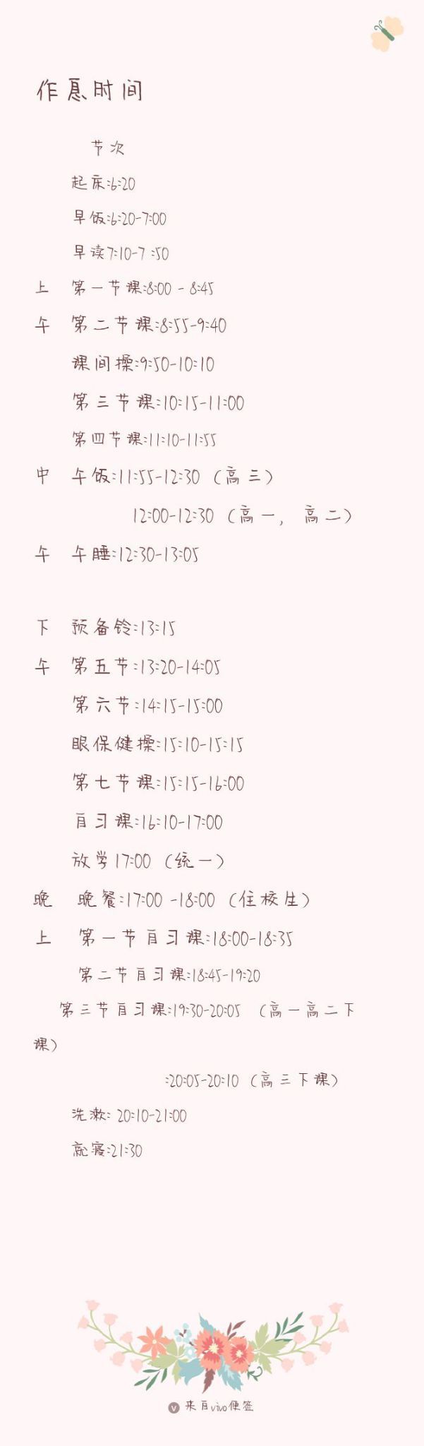 洛伊作息时间表格有点长,所以标题被遮住了(补充一下,这个中午吃饭时间为什么高三先吃,是因为高三的学生马上就要高考了,所以把高三时间提前,后面再会调整)