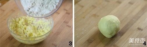 低筋面粉过筛后,和杏仁粉一起倒入黄油里;用手揉拌均匀,成为光滑的面团。将面团放入冰箱冷藏半个小时