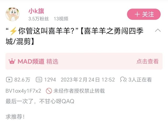 接下来就是一些个人认为非常非常非常好的视频,(注意:所有都跟喜羊羊有关,视频仅在B站,也就是哔哩哔哩发布,而且大部分是卡点混剪,都值得一看。)