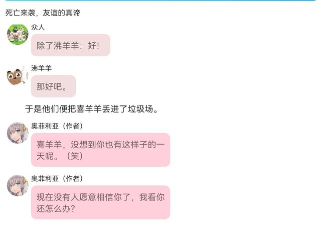 “我……我……我没有!”梦羊羊支支吾吾,不知该如何狡辩。下一秒,一个响亮的巴掌了“啪”在了她的脸上,梦羊羊一脸不可置信的看着另一个时空的喜羊羊。(另一个时空的喜羊羊,后面叫喜羊羊二号)