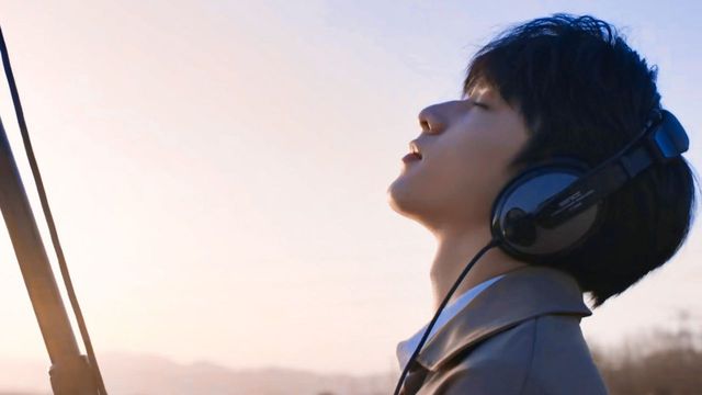 画面中的男人戴着耳机,微仰着头,赤色的阳光洒在他脸上,衬得五官更加清隽。他的面容沉静而深邃,仿佛在聆听着世界的声音,整个人散发着一种沉静而优雅的气质。