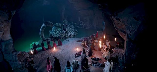 魏无羡瞬间夺剑反杀,将剑抵在温晁脖子上,后退一步,纵身一跃,退到身后的一座石岛上