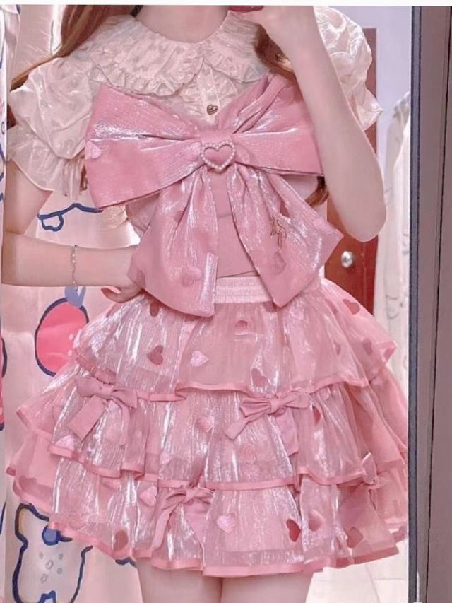 她的下身穿着一条粉红色的短裙,腿上穿着一双白色丝袜,一双粉红色的矮跟高跟鞋
