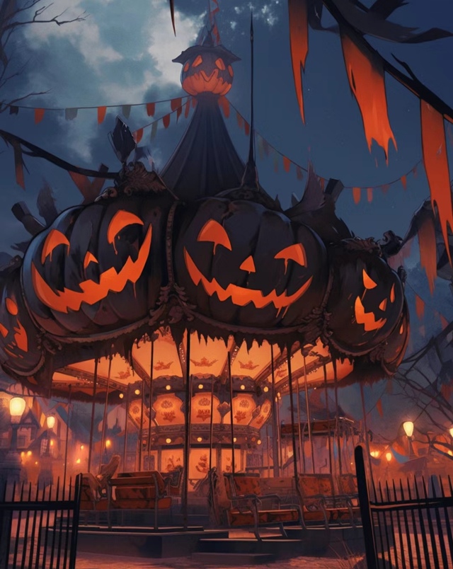 这里到处都充满着诡异的气息.那些游乐设施上的南瓜头更是恐怖至极.