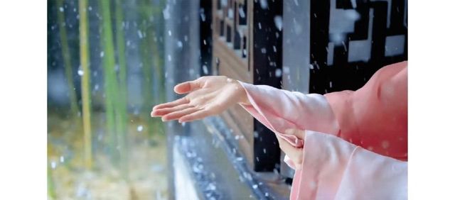 在亭中有身穿单粉色薄衣裳头戴朴素的发簪身上披着的是一件单薄的披风坐在亭边她趴伏在亭椅上伸出手感受雪落在手心的感觉