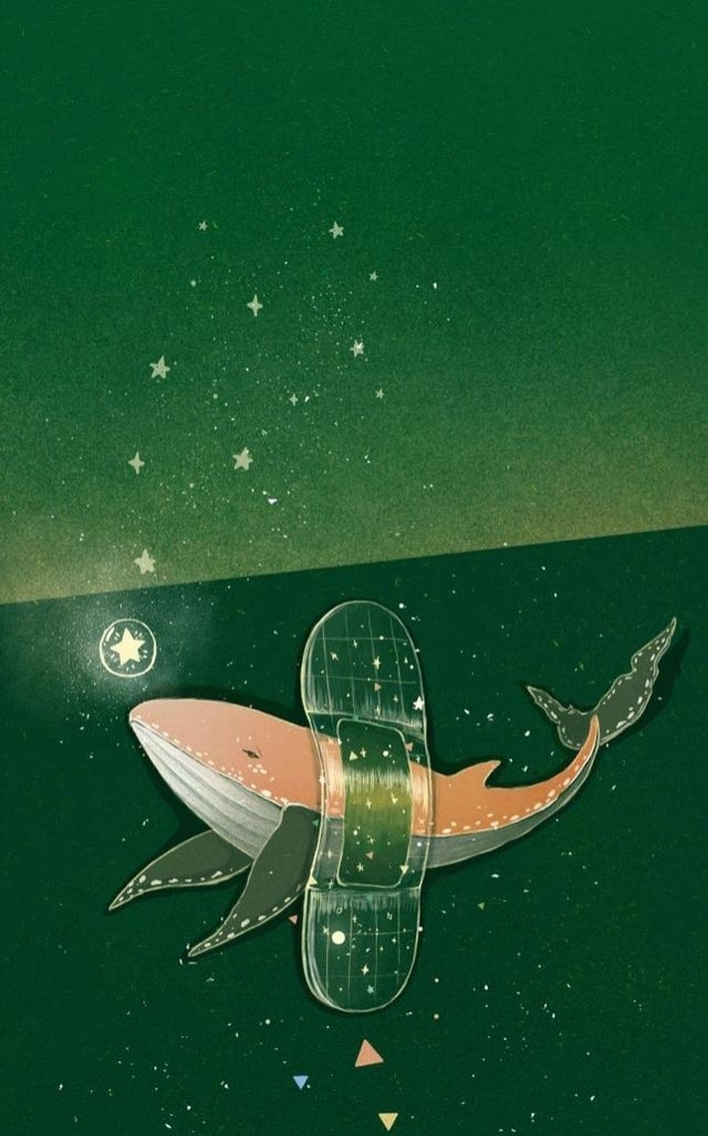 从前,在一片绿色的海里,生活着一条鲸鱼,饲鲸者对她很好,一次意外,她误入到了一片暗礁,不小心刮伤了腹鳍和鱼肚,饲鲸者很是心疼,却也没忍心责怪她,准备创口贴的时候,在店里看到了一种特别大的创口贴,脑子里冒出一种想法——