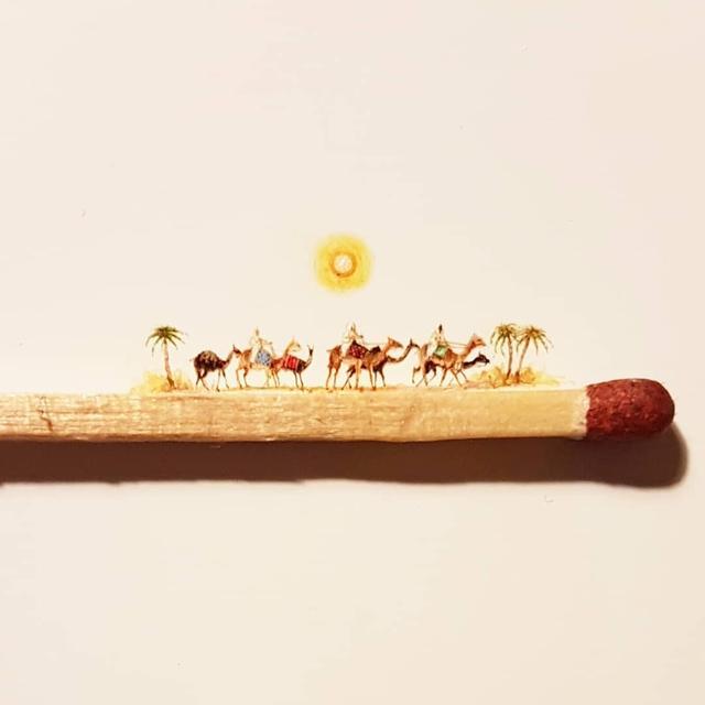 仔细一看,小孩手上捻着的那根火柴,上面有小小的队伍在走,骑着不算很快的骆驼,不辍行走,原来他们都是向光而生的人,惧怕黑暗,黑暗的来临会给他们带来疾病、恐慌,他们想要赶在太阳西去,夜幕降临前走到火柴头 点亮火柴,照亮黑暗