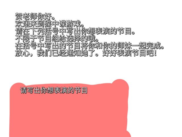 贺峻霖贺老师你好。 欢迎来到碟中谍游戏。 请在下列括号中写出你想表演的节目。 不限于节目组给选择的哦。 在括号中写出的节目将你和你的师妹一起完成。 放心,我们已经通知她了。好好表演节目吧!