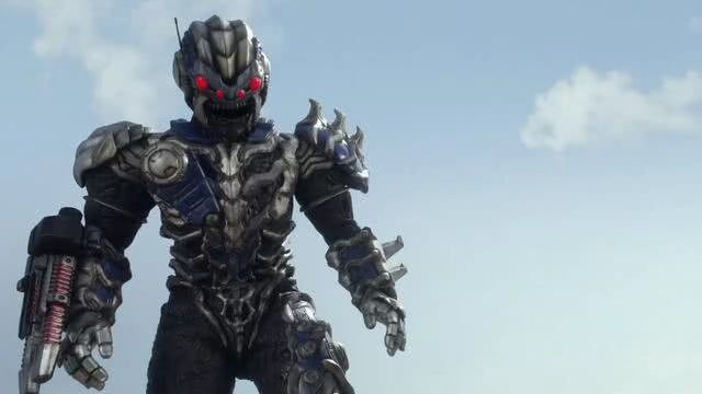 男人睁大眼睛,很快,圆盘飞船朝河岸无人的广场投下一道白色的光柱,随着那道光柱,一道神秘身影快速降落,将那身影投下后,圆盘飞船自动飞走了,那是个半机械的人形外星生物,身上机甲色调为蓝银色,他头部像是蜘蛛,有着四只红色眼睛,与狰狞的大牙利齿,他右臂有着机枪造型的武器,浑身多处都是改造过的痕迹