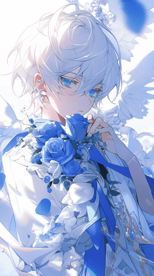 一个长相出众的少年,手里拿着蓝玫瑰,倚靠在窗边。