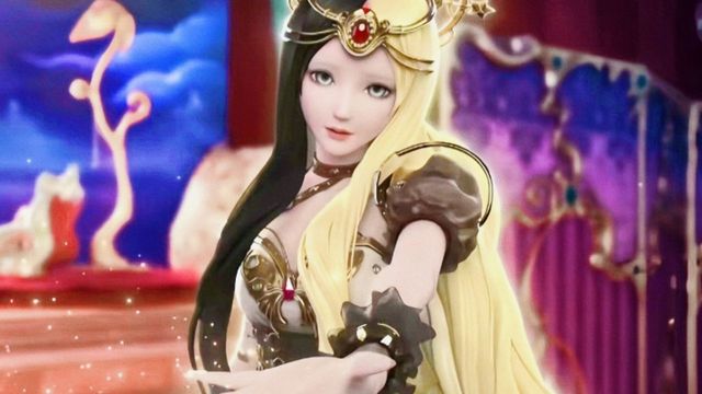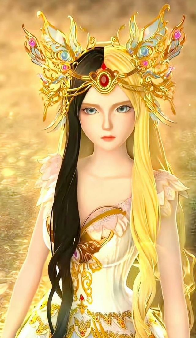 变回了最初时的模样,淡金色的长发,右边有一绺黑色。头戴金黄琉璃色蝴蝶发饰。涂有一层薄薄的透明色闪烁眼影。腰前坠有两条金黄色流苏。裙摆如同羽翼自然垂下。白金色的高跟鞋,如同天使降临时般耀眼!