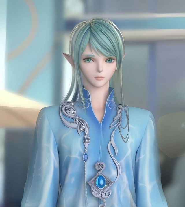 一位拥有蓝色头发的年轻男子,风格融合了浅银色和宝石蓝,深银色和浅宝石蓝,, ,精灵,长发,,绿色眼睛,宝石,水蓝色头发